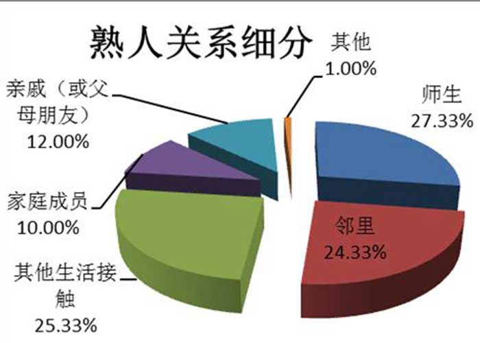 我们先看一个图,《“女童保护”2016年性侵儿童案件统计及儿童防性侵教育调查报告》显示,2016年公开报道的性侵儿童案件的778人中,女童遭遇性侵人数为719人,占92.42%。7到14岁受害者居多,熟人作案的比例高达69.28%,其中师生之间是27.33%,邻里之间是24.33%。