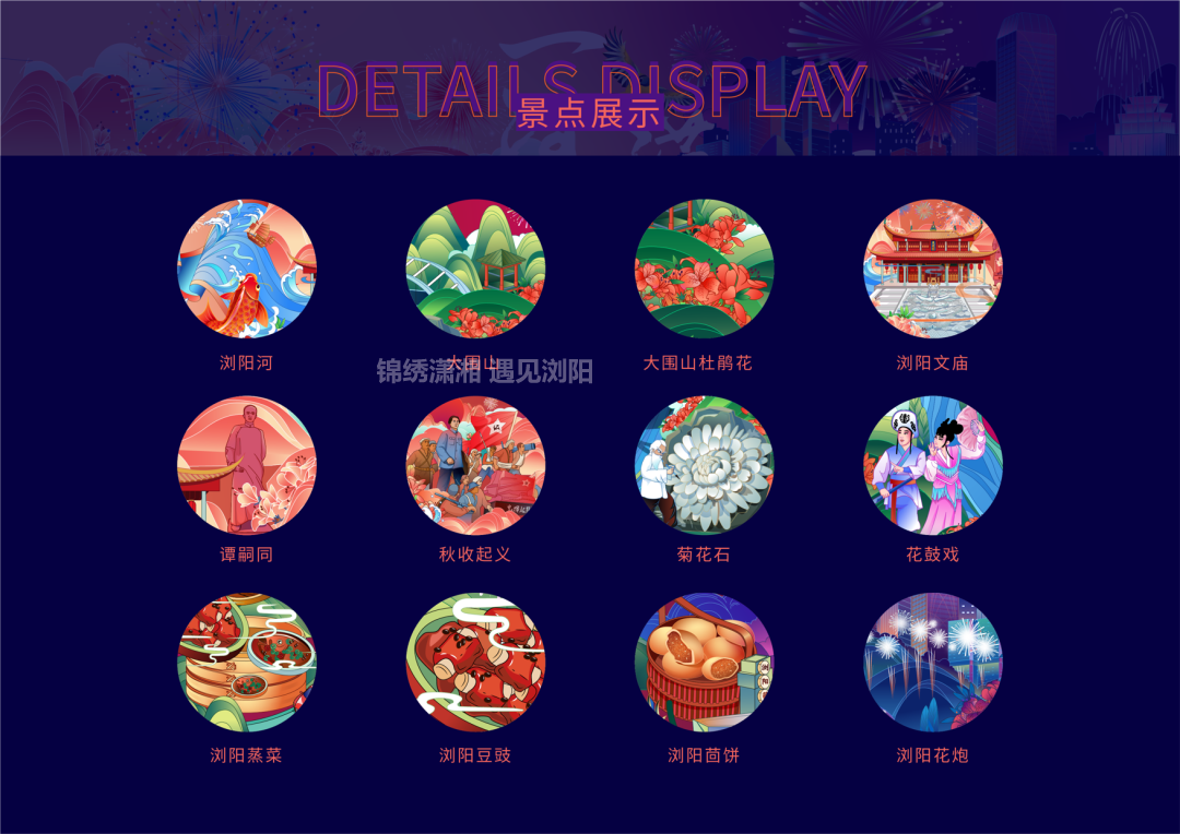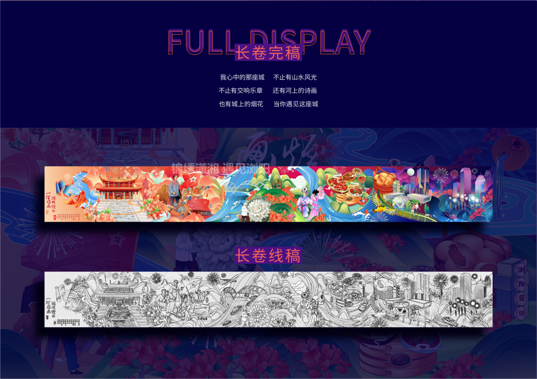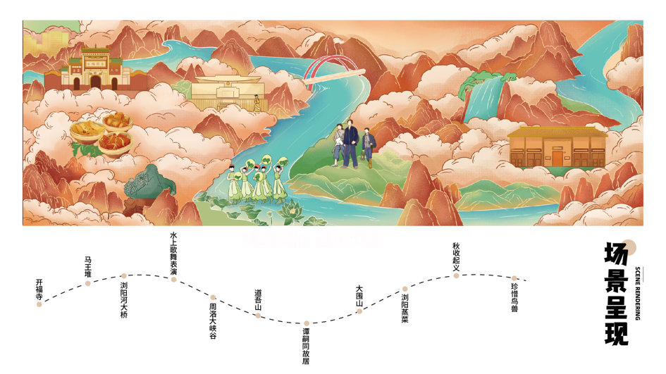 以河流和烟花为主线,表现出城市从日出到日落的颜色变化,用矢量国潮的技法,展现出浏阳城从国潮到科技的城市特色。全幅画面以卷轴的形式表现,体现出浏阳如美丽画卷上的旅游城市,吸引更多消费群体,拉动城市旅游消费,带动城市产业发展。“一河诗画,满城烟花”描述的不止是山水风光,还有美食、菊花石布满的生活气息,更拼搏向上的浏阳人民对美好生活的追求。