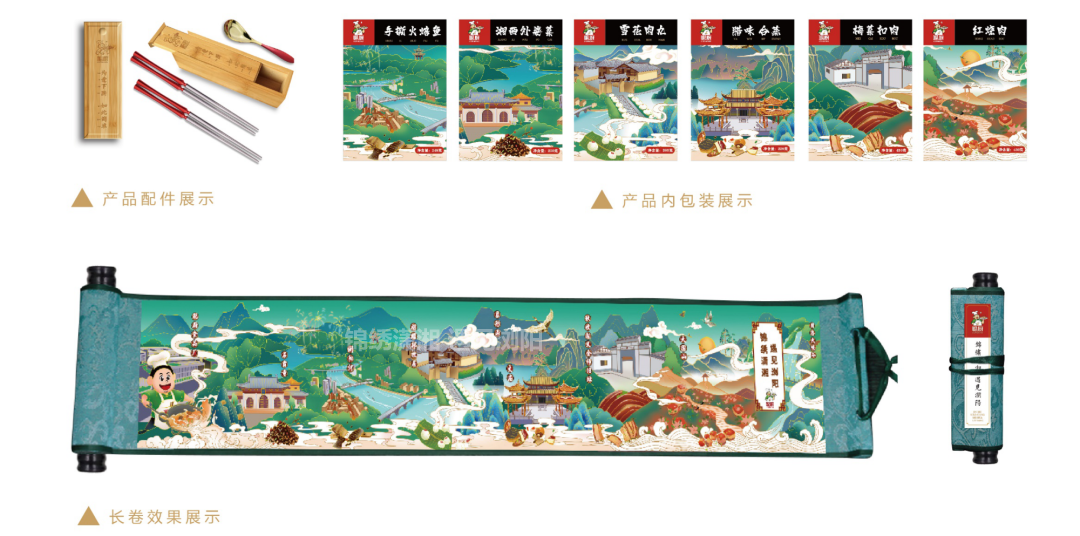 作品将浏阳标志性的景点浏阳河、石霜市、胡耀邦故居等和浏阳非遗元素浏阳花炮、菊花石、夏布等融合一体,绘制成一张长卷,全面展现了浏阳的城市风貌和文化特色,同时,画面中巧妙融入了浏阳特色美食,并将其和聪厨品牌联系在一起,达到了美食、美景互相交融,文化和历史相得益彰的境界。