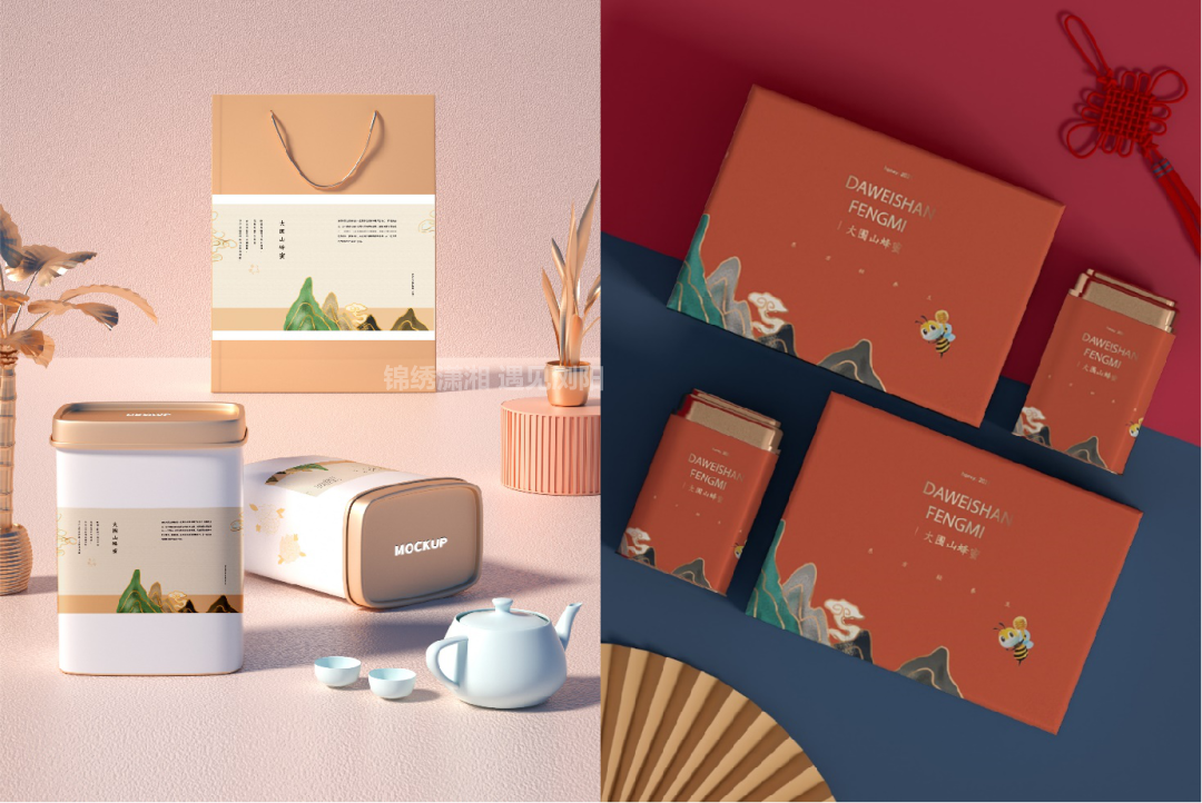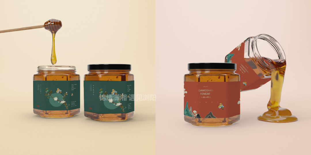 大围山蜂蜜包装设计,采用山水元素,以青绿色为主,整体以插画形式呈现,图案的选用上主要以大围山和大围山蜂蜜的装饰元素为主,贴近自然,体现出大围山蜂蜜的独特之处。包装用红色背景搭配金色字样进行点缀,并加以蜜蜂进行点缀,彰显产品的健康与美味。
