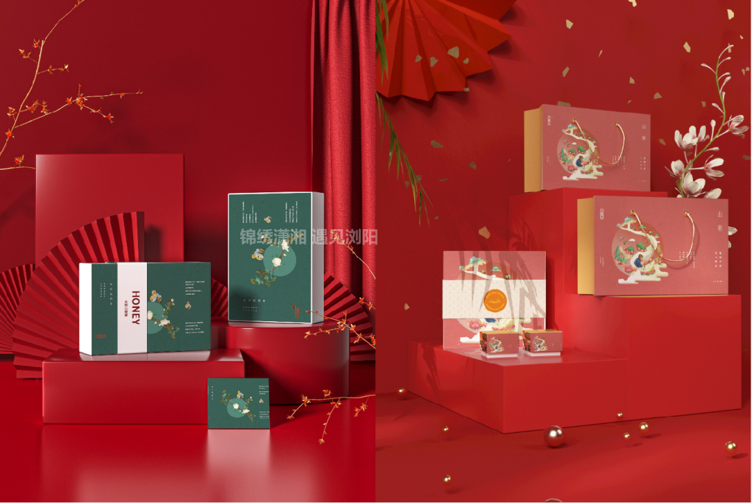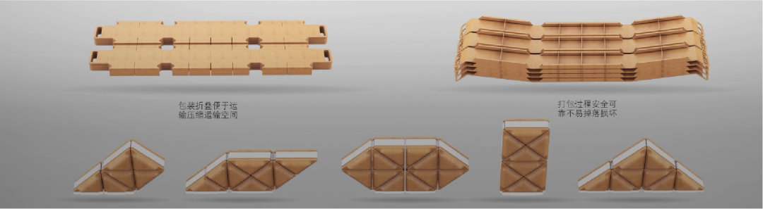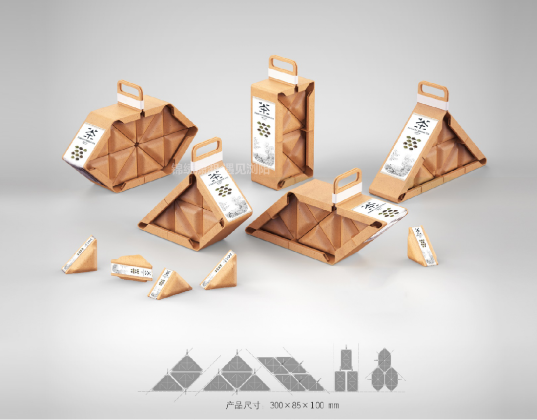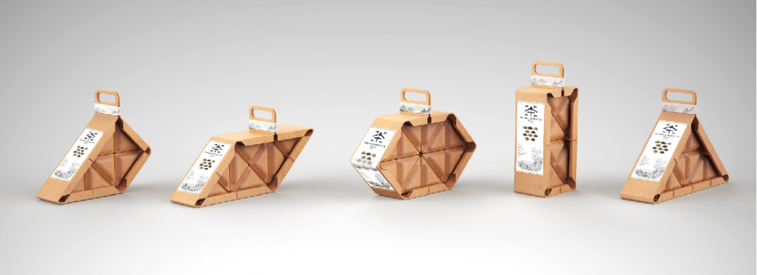 包装设计根据本土特产整箱运输包括消费者购买后的拿取方式为设计痛点,分析进行了前期调研,通过正负形设计原理设计角度为75°与60°,便于运输时合理的空间布置;其次,从材料角度出发采用环保可回收的材料,体现绿色健康可持续的设计思路,最后在消费者打开瞬间发现创意,体现包装与人之间的互动关系,更为贴近生活,提升人文关怀。