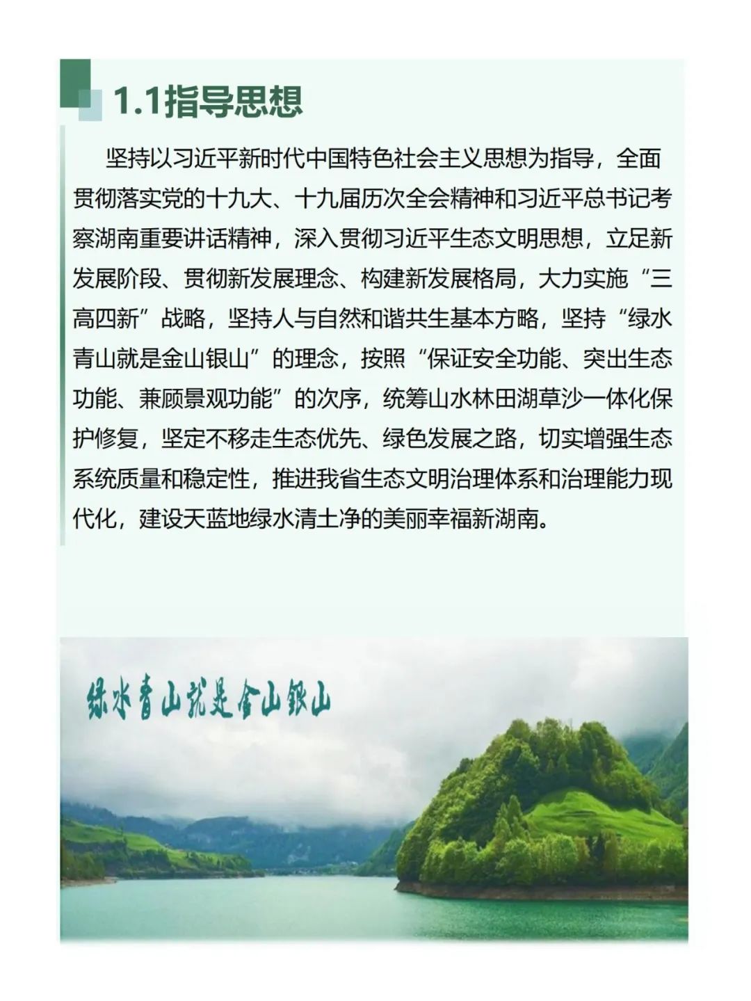 《规划》坚持以习近平新时代中国特色社会主义思想为指导,全面贯彻落实党的十九大、十九届历次全会精神和习近平总书记考察湖南重要讲话指示精神,深入贯彻习近平生态文明思想,立足新发展阶段、贯彻新发展理念、构建新发展格局,全面落实“三高四新”战略定位和使命任务,坚持人与自然和谐共生基本方略,坚持“绿水青山就是金山银山”的理念,按照“保证安全功能、突出生态功能、兼顾景观功能”的次序,统筹山水林田湖草一体化保护修复,是我省当前和今后一段时期推进生态保护修复的指导性规划,是编制和实施有关重大工程建设规划的主要依据。