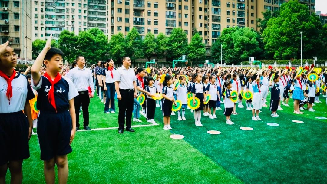 鲜艳的五星红旗冉冉升起,庄严的队礼和嘹亮的国歌是少先队员们对祖国母亲最赤诚的致敬;清亮欢快的校歌萦绕耳畔,鲜艳的校旗迎风招展,异口同声的吟唱和真诚温暖的目光是学子们对砂小校园最清澈的热爱。