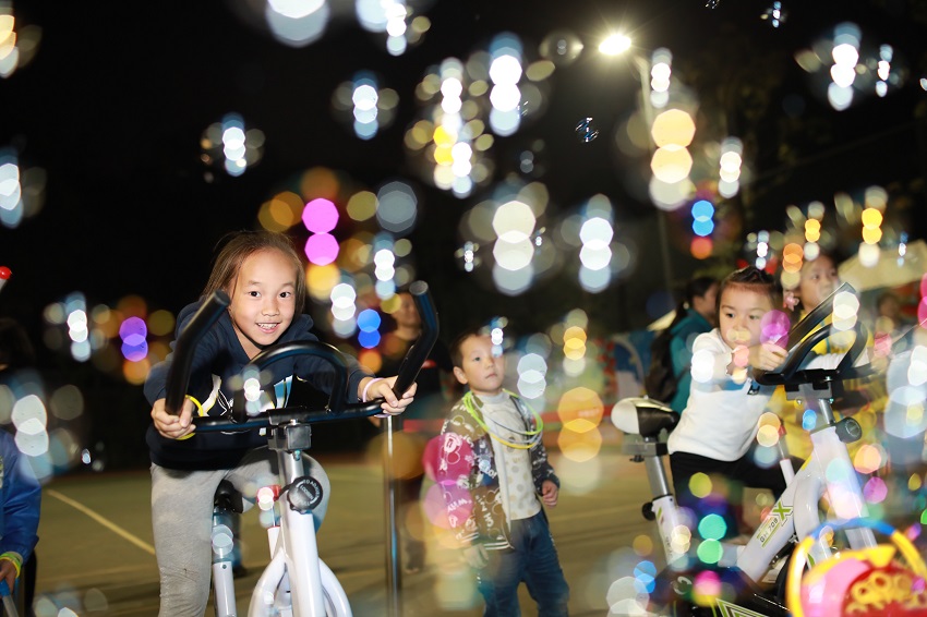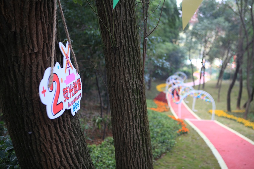 此外,400米长的夜光跑道,以及场地上的标志、记号等,也采用荧光材料构建,在夜幕中营造出温馨浪漫的气氛。热闹的亲子盛宴,在天黑后立刻开场,树屋、山林、草地......到处闪烁着孩子们用荧光勾勒出的绚烂画面。“牵着女儿一起跑步时,我一下子想到她学走路的场景。”小雨轩的爸爸说,“脑海里不停地闪现出陪伴她成长的点滴,我以后要鼓励她更加勇敢,多一点尝试。”