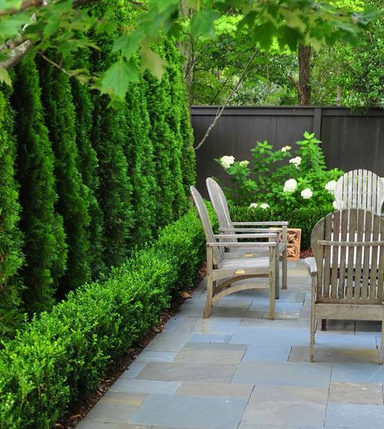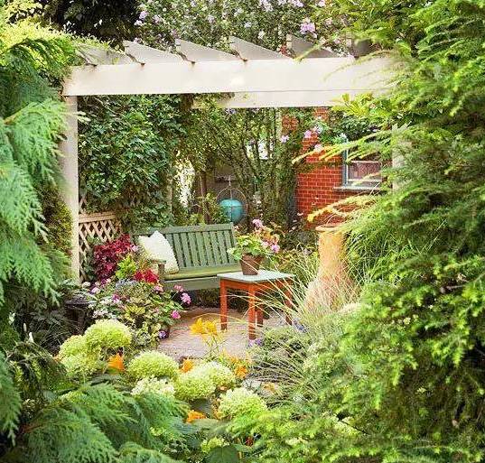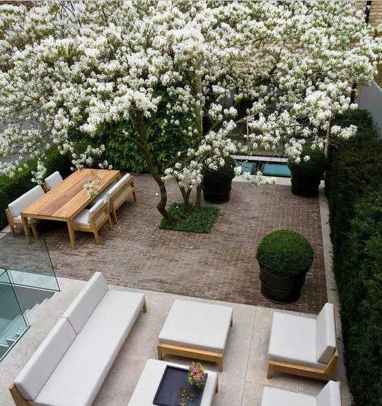 院子的边界区域则可以在不妨碍采光和通风的情况下,多种植高大的落叶乔木和花灌木,用来隔绝外界噪音的同时,也有利于保护私密性。