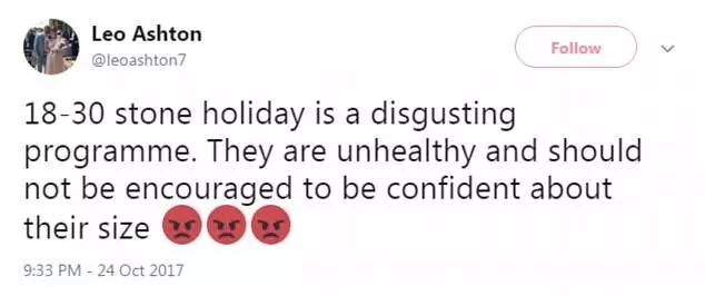 “这片子太恶心了,他们完全是不健康的啊,搞不懂为什么会鼓励人们对这种尺码而感到自信”