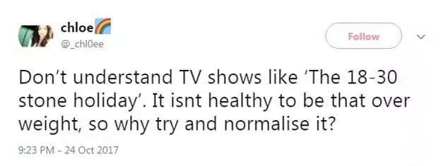 “不太理解为啥现在这样节目会出现,这种体重明明很不健康,为啥他们都在试图让人们觉得是正常的?”