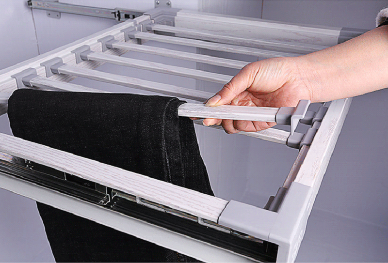 正装裤,既怕褶皱,叠放不是明智之选。建议装个裤架,根据数量决定尺寸。使取放自如,颜色、质地一目了然。