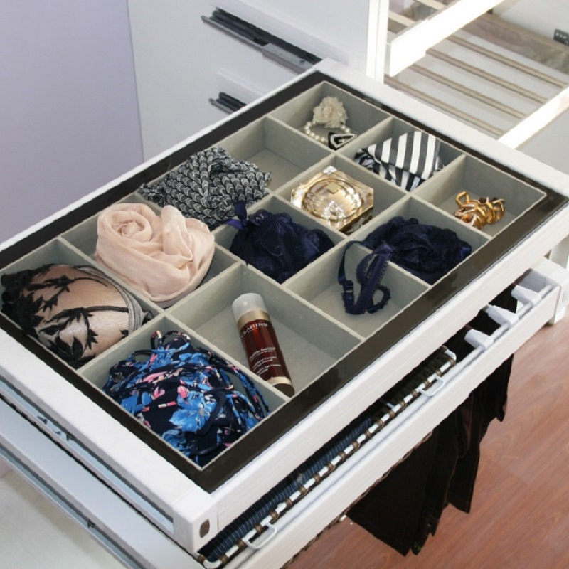 也叫格子架或格子抽,用来装些领带、袜子、内衣等小物件,也可以装女生用的一些配饰,空间区分明显,哪个东西在哪个位置很容易看到,找东西时很方便。