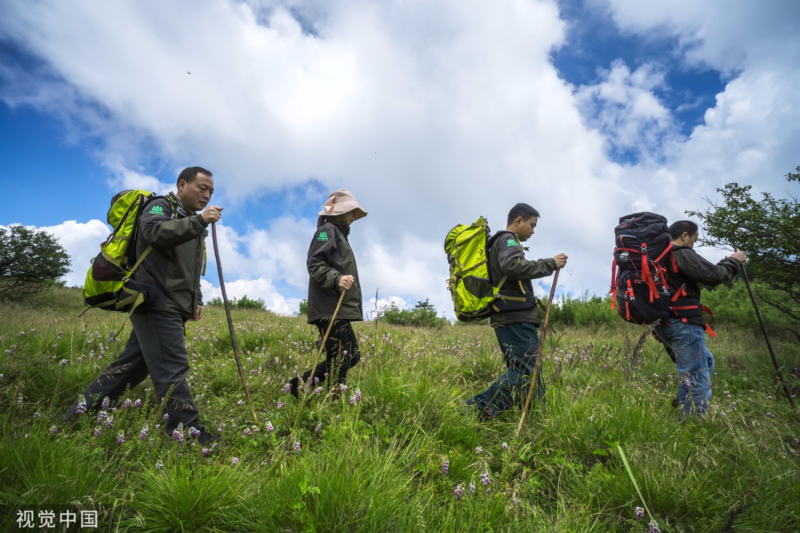 盛夏时节,海拔3000多米的神农顶。有这样一群人,正背着沉重的行囊穿行在没有路的草甸和密林之间,他们是神农架国家公园的专职生态巡护员。神农架国家公园管理局介绍,虽然已建成卫星遥感、直升机、无人机巡护的“天网”和电子围栏、地面固定摄像头组成的监管“地网”,要实现无死角监控,仍然需要人工野外徒步巡护。图为湖北神农顶管护中心的巡护员高山草甸上穿行。(图片来源:视觉中国)
