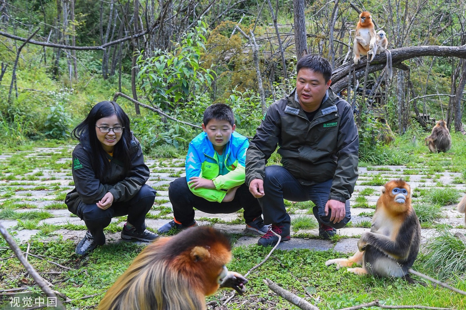 神农架有22名女巡护员,黄丽就是其中之一。她长期在野外工作,一家人分处3地,丈夫在大龙潭金丝猴基地工作,儿子远在100多公里外的松柏镇由外公外婆照看,每个月只能回家一次。图为女护巡员黄丽(左一)完成野外巡护任务后,带着儿子前往大龙潭探望丈夫。近年来,神农架国家公园管理局不断招录高校毕业生,更多热爱生态保护事业的年轻人正加入到巡护员队伍。