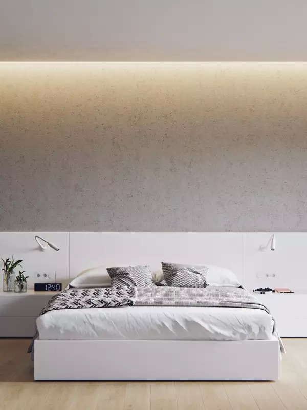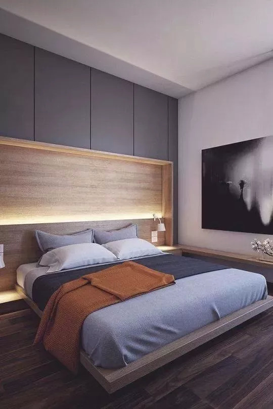 由于整体卧室大多采用定制的形式,所以在空间利用上一般较少浪费,而是尽可能地贴合墙面设计,采用嵌入式、一体式的方式,达到完美的视觉延伸效果。