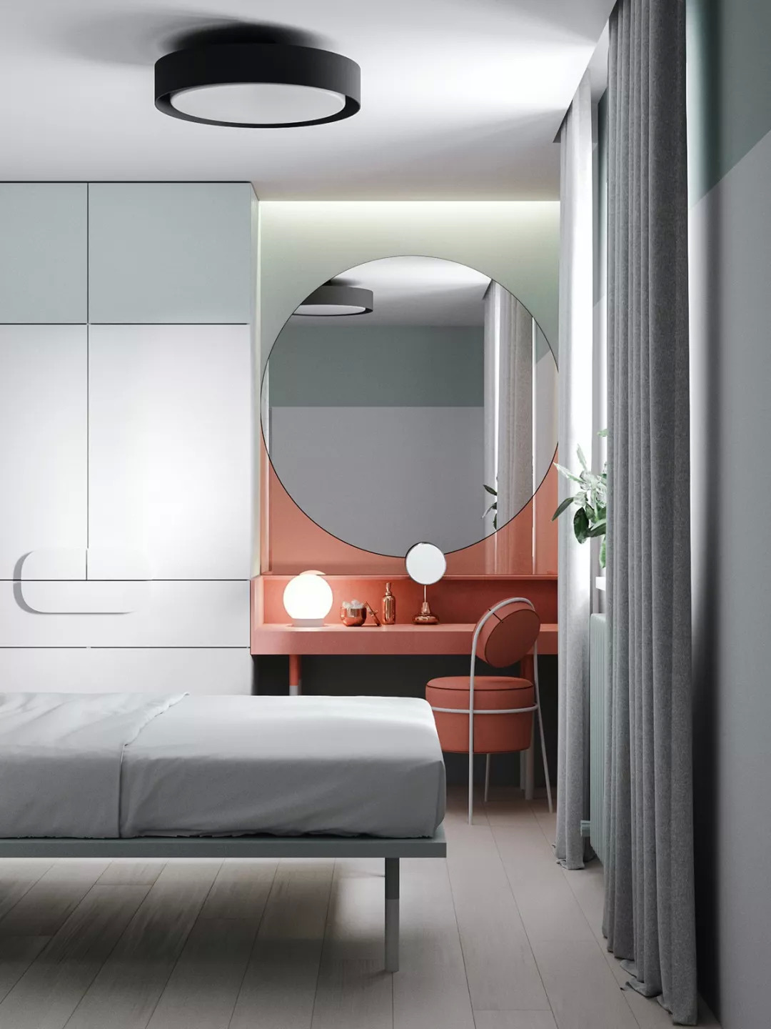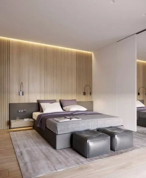 而整体设计的妙处,就在于可以将衣柜与墙面合二为一,或者让卧室门直接嵌入墙壁之中,弱化它们的存在感,让空间氛围浑然一体。