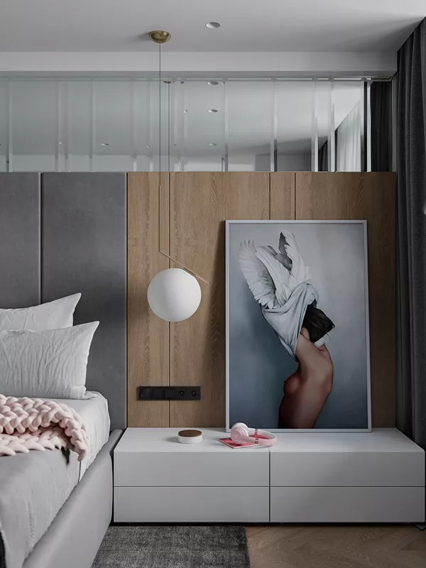 比如,在床头背景墙的设计上,为了不跟别人“撞风格”,你可以植入自己的新鲜创意,采用大尺寸的艺术画装饰,为卧室打造独一无二的亮点。
