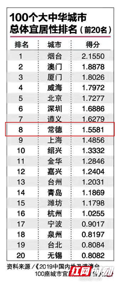 2019中国内地及港澳台100座城市宜居指数排名,常德位列第8名。