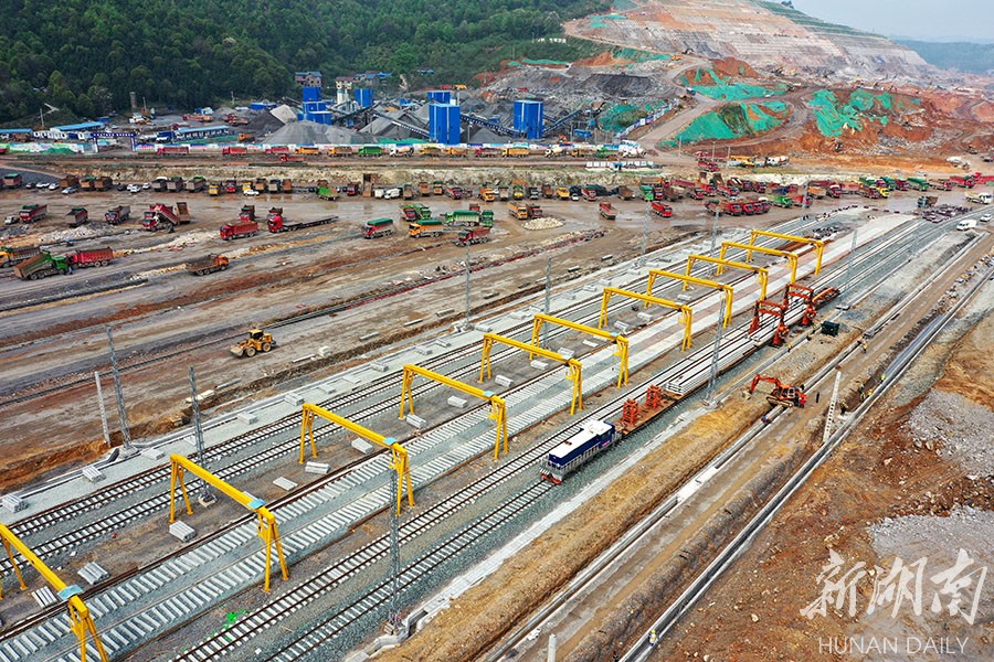 施工方放弃春节休息,目前组织1600多人、500多台施工机械全力推进项目建设,土方施工和高边坡开挖、支护施工已进入尾声,到达场及下行到发场开始铺轨施工。 湖南日报记者 田超 通讯员 谌海平 摄影报道