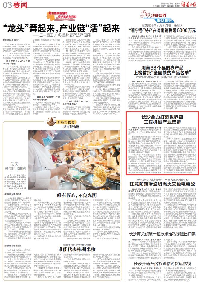 2个多月前,正值疫情肆虐,举世瞩目的火神山医院、雷神山医院先后10天、12天建成,举世瞩目的“中国速度”背后,闪耀的是数百台长沙工程机械的“鬼斧神工”。今年以来,新冠肺炎疫情对海内外产业链上下游造成了较大冲击。长沙工程机械企业主动出击,加快抢补项目实施进度,一大批项目亮点频出:如三一集团销轴项目的实施和落成,有望解决长沙地区共性零部件销轴的供应问题;中联重科全球发布全新研发的凌云系列泵车;山河智能国内首台液压混合动力挖掘机已完成样机试制;铁建重工国产首台新型千米级水平取芯钻机成功下线,填补了我国千米级水平取芯钻探领域的空白。