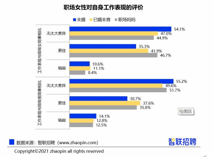 报告称,职场妈妈认为自己工作表现较同级女性同事更佳的占比为46.7%,高于已婚未育女性(41.9%)与未婚女性(35.3%)。在与同级男性同事相比时,51.7%的职场妈妈选择“无太大差异”,具有优越感的占比则为35.8%。