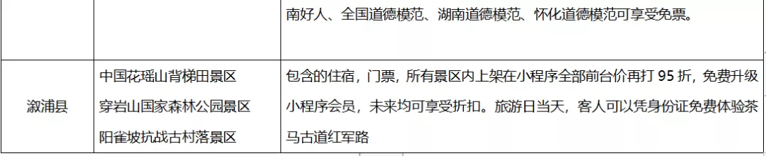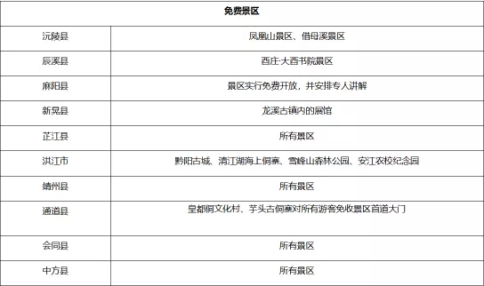 当天,怀化13个县市区也纷纷推出景区门票免费等旅游优惠措施。其中,会同、靖州、中方、芷江、麻阳等地所有景区门票免费;沅陵、辰溪、溆浦、鹤城区、新晃、洪江市、洪江区、通道等地部分景区门票免费,并实施折扣优惠政策。