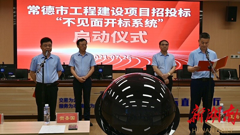 湖南日报·新湖南客户端7月26日讯 (记者 卓萌)7月26日,常德市工程建设项目招投标“不见面开标系统”在市公共资源交易中心正式启动运行。常德市人民政府副秘书长王海波、市公共资源交易中心党组书记贺圣国、市公共资源交易中心主任刘保湘出席启动仪式,市公共资源交易中心党组副书记、副主任丰朝晖主持启动仪式。
