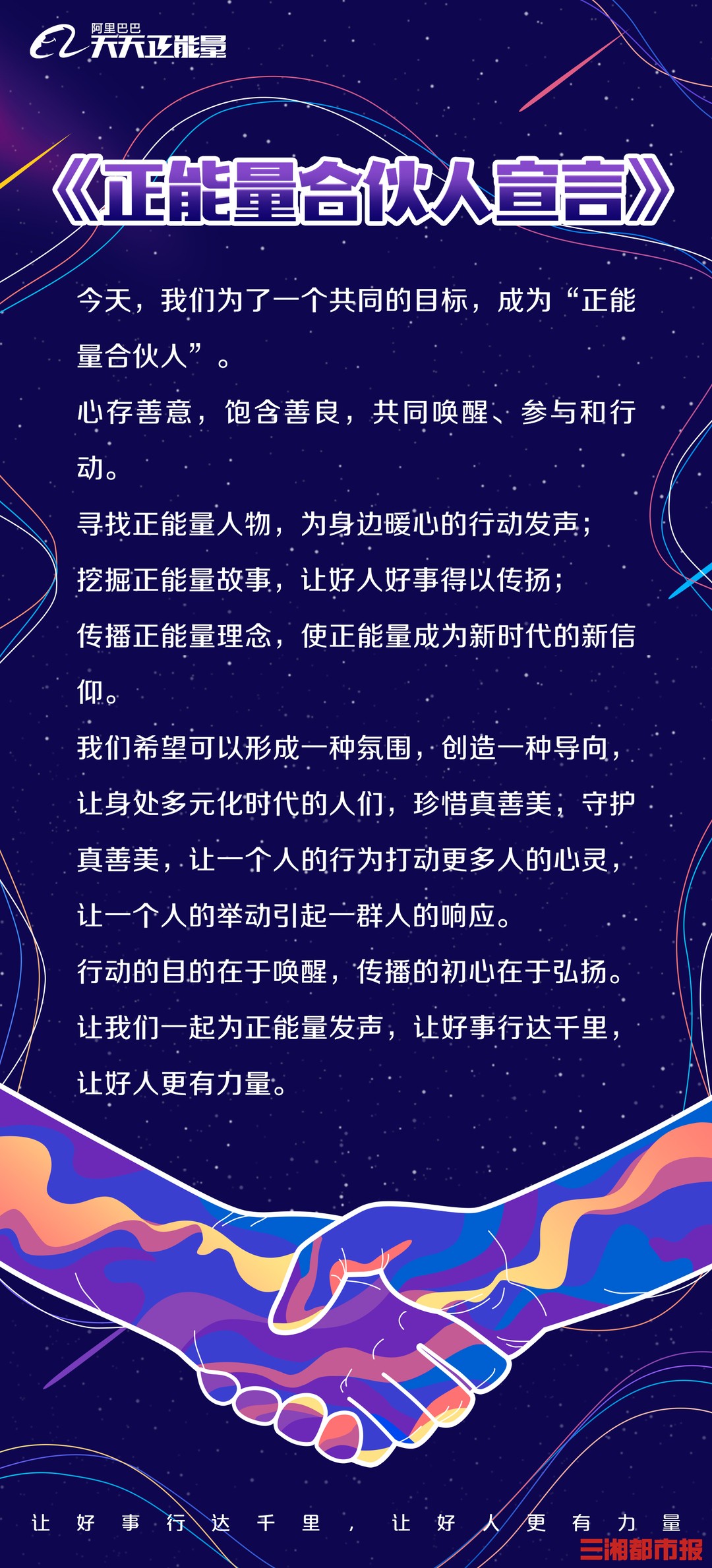 11月1日,三湘都市报联合阿里巴巴天天正能量发起的 “正能量合伙人计划”迎来首次“焕新升级”--天天正能量发布2021届正能量合伙人名单,来自公益界、学界及各行各业的217位优秀代表入选,由本报推荐的湖南省文化馆副馆长、艺术中国杂志主编曹隽平,长沙慈善会、长沙慈善基金会筹募发展部部长黄灿等7位名列其中。他们将和天天正能量一起为善发声,参与正能量奖励评选、公益活动落地。