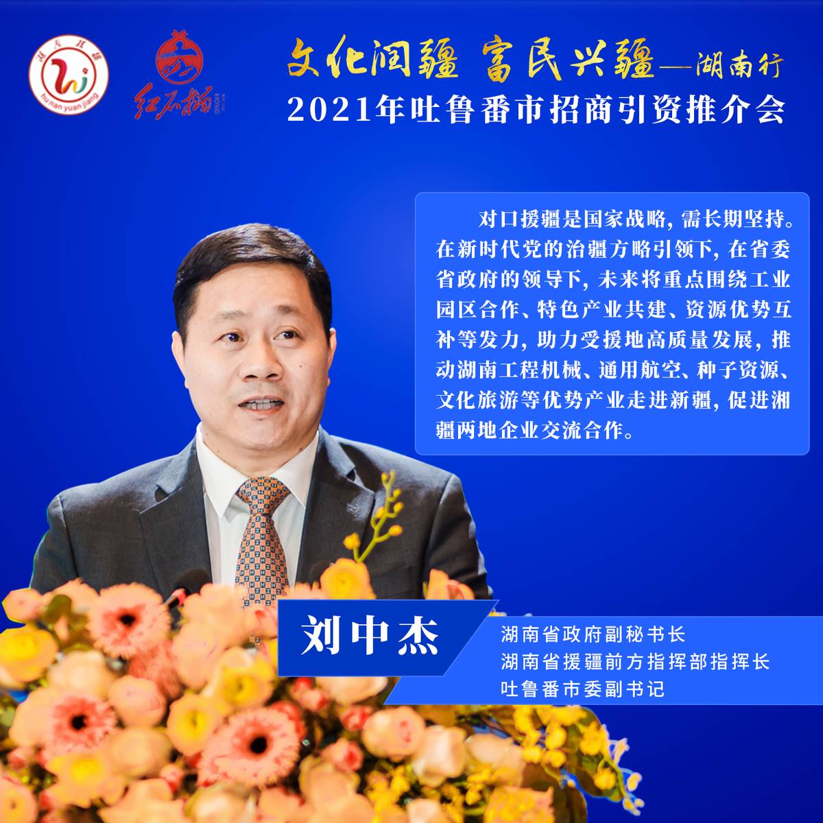 (湖南省政府副秘书长、湖南省援疆前方指挥部指挥长、吐鲁番市委副书记刘中杰致辞)