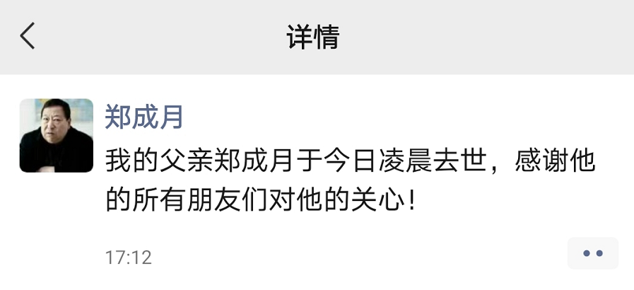 郑奥告诉红星新闻,在去世之前,其父亲身体状况还算可以,没有发现明显的异样。去年郑成月做了肾移植手术,恢复情况还算可以,其他方面没有太多问题。现在家人正在着手处理后事。
