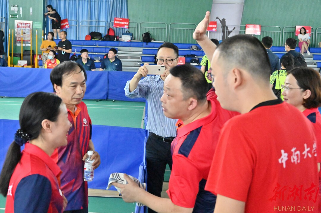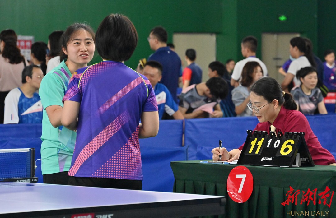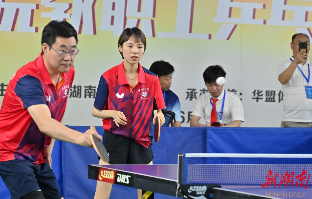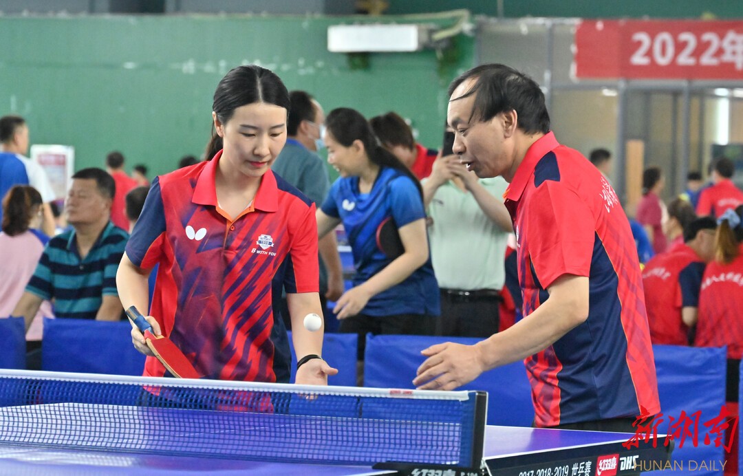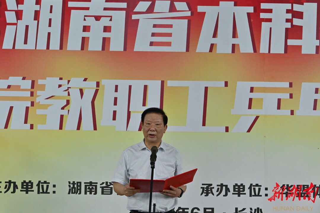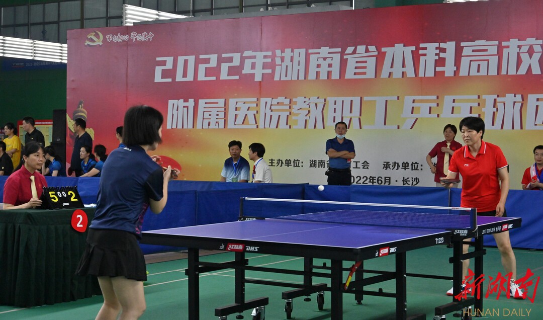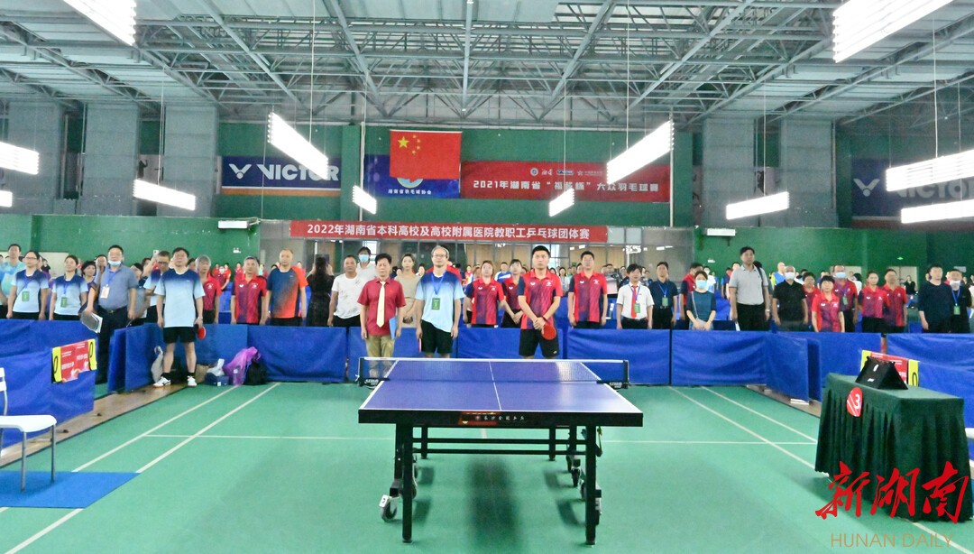 新湖南客户端6月18日讯(记者 郭芝桃 胡旻 实习生 彭骏捷 文湘玥)6月18日上午,2022年全省本科高校及高校附属医院教职工乒乓球混合团体赛在省人民体育场开赛。本次赛事为期两天,来自全省40所本科院校及附属医院的400余名乒乓球运动爱好者参赛。省教育工会二级巡视员王常华主持开赛仪式,省教育工会主席高新明致辞并宣布开赛。