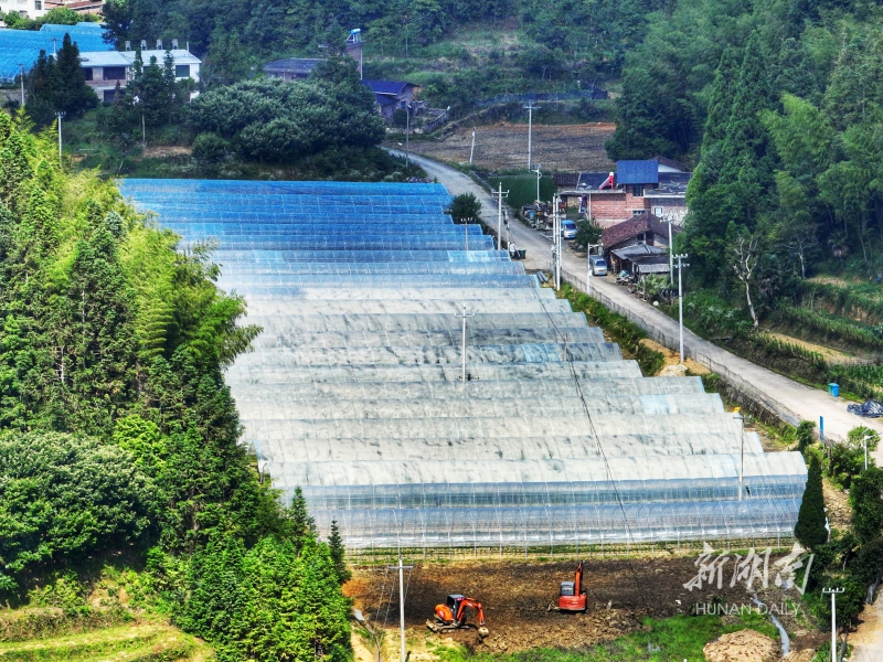 6月26日,桂东县普乐镇齐云山村,群山中新修的蔬菜基地。今年,当地农业企业欣荣公司投资500万元,在山坡上搭建了50个标准大棚,建立了“公司 农户 基地 技术 销路”的乡村振兴共富平台,成为产业振兴、村民增收致富的新引擎。湖南日报全媒体记者 童迪 通讯员 郭兰胜 摄影报道