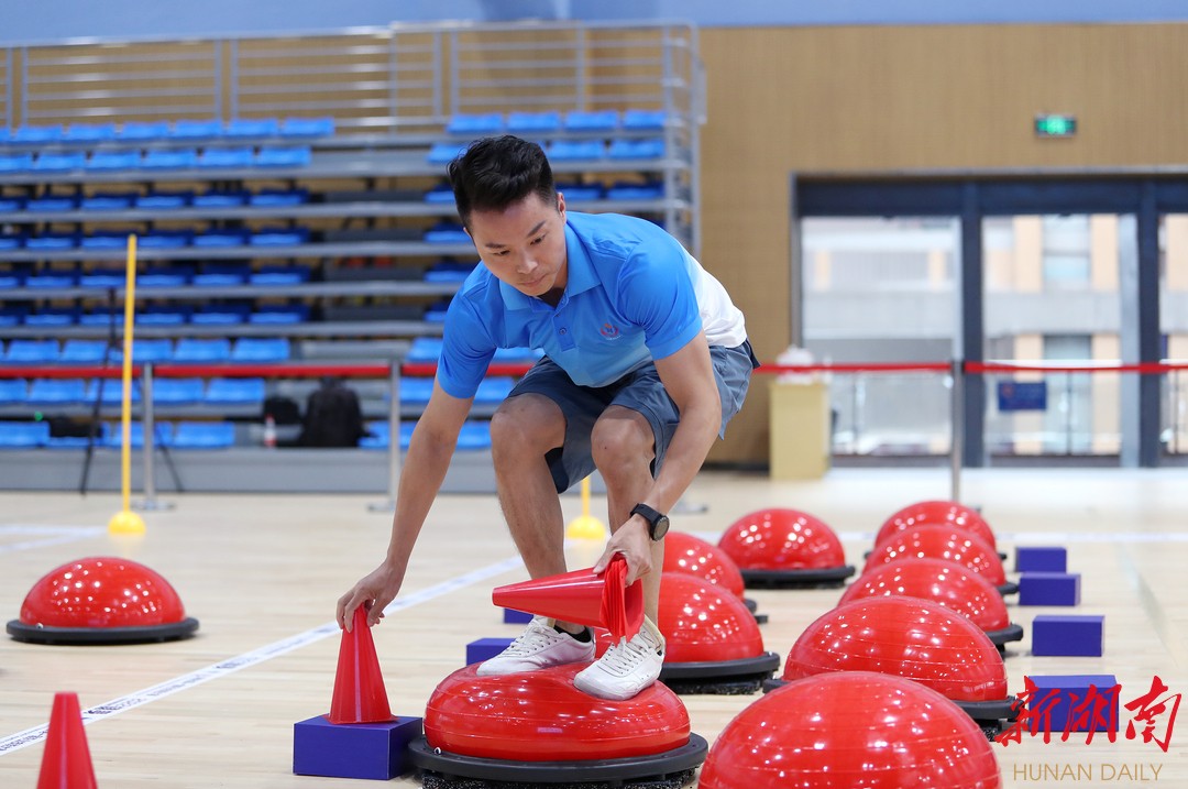 省体育局代表队参赛代表李实在进行体能项目bosu球跨越比赛中