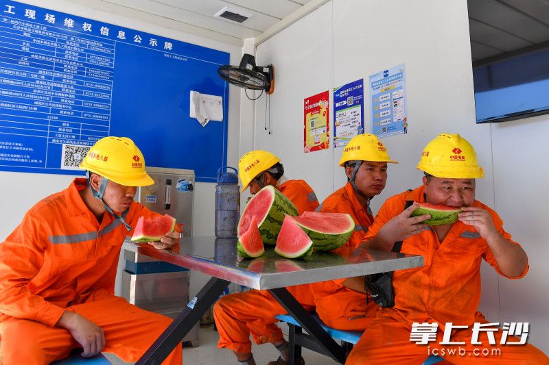 在7号线汽车南站休息区,施工人员在吃西瓜。