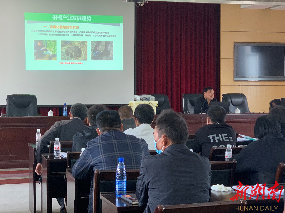 在保靖县库区移民新型职业农民培训班上,柑橘栽培专家彭际淼围绕现今柑橘产业面积、品种、栽培等发展趋势,分析了保靖县柑橘产业现状等相关理论知识。