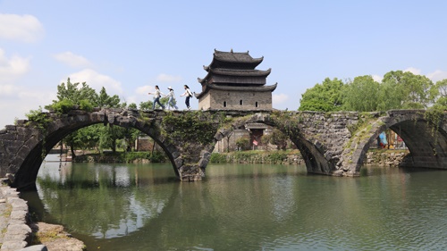 夏层铺镇上甘棠村风景秀丽,游客在步瀛桥上欣赏千年古村的迷人风光、古建民居。