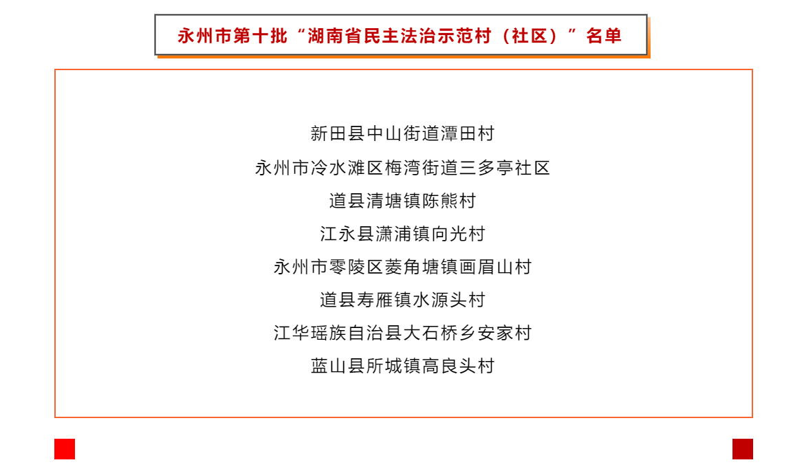日前,湖南省司法厅、湖南省民政厅发布了《关于命名第十批“湖南省民主法治示范村(社区)”和公布复核结果的通知》,其中,永州市8个村(社区)荣获第十批“湖南省民主法治示范村(社区)”称号;76个村(社区)保留“湖南省民主法治示范村(社区)”称号。