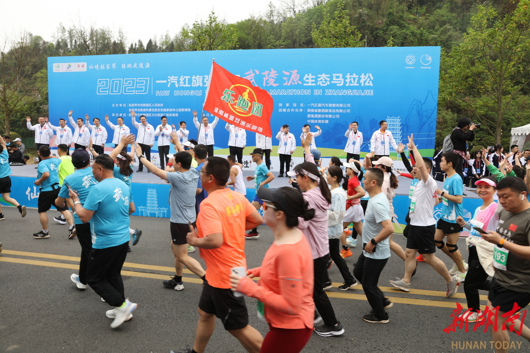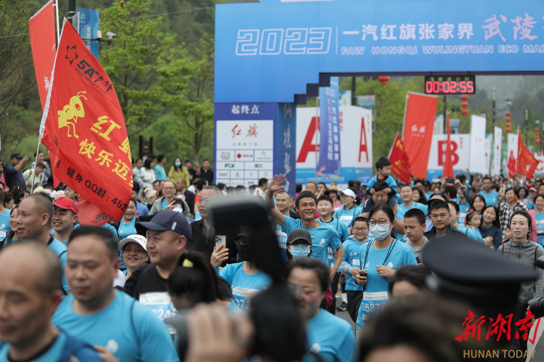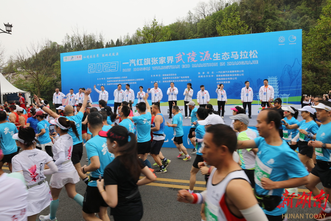 新湖南客户端4月15日讯(记者 胡旻)4月15日7时40分,随着发令枪响,2023“一汽红旗”张家界武陵源生态马拉松在张家界武陵源标志门激情开跑。湖南省体育局局长罗双全宣布开赛,超7000名马拉松爱好者参加比赛,用脚步丈量武陵源。