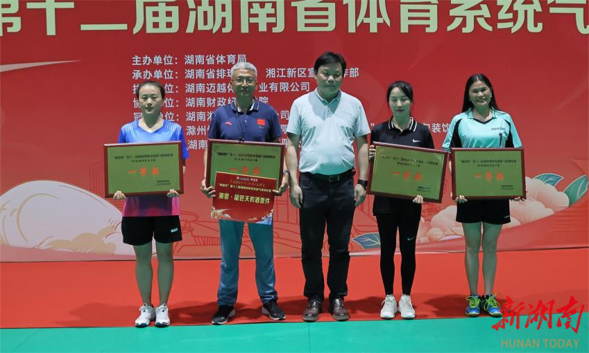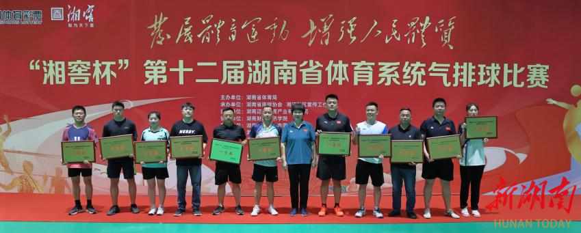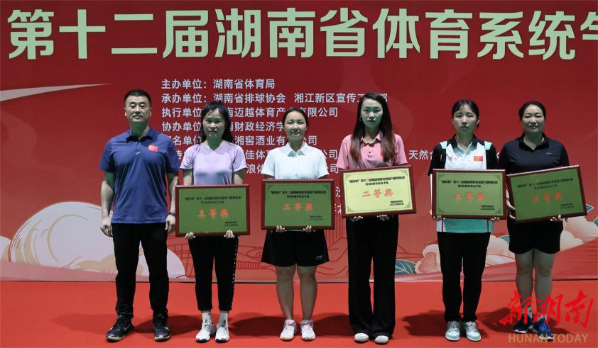 新湖南客户端6月12日讯(记者 胡旻 实习生 何思羽 文湘玥)6月11日下午,“湘窖杯”第十二届湖南省体育系统气排球比赛在湖南财政经济学院圆满收官。经过2天88场比赛的激烈角逐,省体育局代表队、湘江新区体育系统代表队和新化县文旅广体局代表队、蓝山县文旅广体局代表队分别斩获了省市级男、女子组,县级男、女子组的冠军。