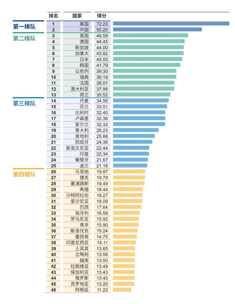 图说:各国人工智能创新指数得分与排名(2022年)