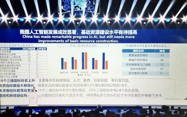 中国排名前5的指标数量从2020年的12个增加到2022年的18个;在网络基础、人才、教育、创新制度、专利等方面排名上升,其中科学和工程博士占比、人工智能专利授权量、AI上市企业数量等多个指标进步显著,跃升榜首。但同时,数据和网络基础指标表现较弱,公共数据质量和开放度不高,网络基础多个指标仍处于参评国家的中等偏下水平。由于今年指标体系的影响,中美在人工智能国际化指标方面与美国的差距变大。“这也是未来我们要发展的方向。”赵志耘说。