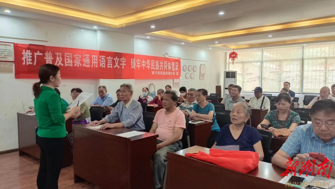 新湖南客户端9月4日讯(通讯员 李娟)9月4日,长沙市天心区坡子街街道西湖社区在新时代文明实践站组织开展“推广普及国家通用语言文字 铸牢中华民族共同体意识”主题宣传活动。
