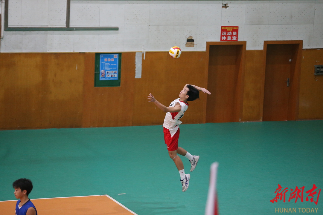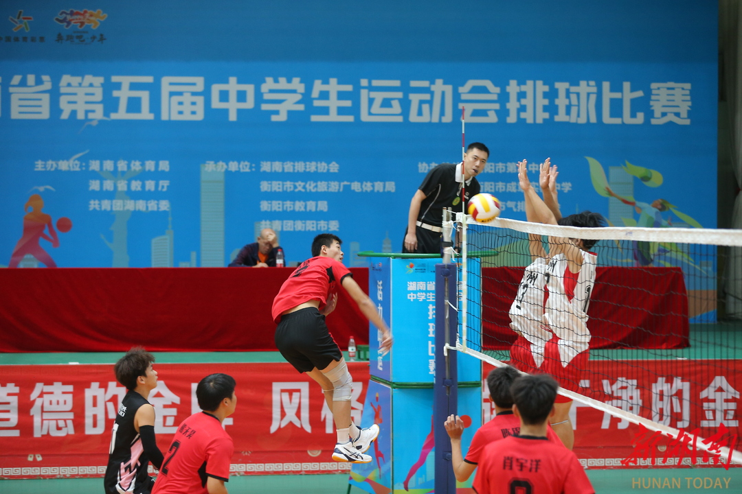新湖南客户端10月17日讯(记者 胡旻)10月16日晚,湖南省第五届中学生运动会开幕式在衡阳市体育中心体育馆隆重举行。本届运动会由省体育局、省教育厅、团省委主办,衡阳市文化旅游广电体育局、衡阳市教育局、共青团衡阳市委承办,将于10月26日闭幕。(图为10月17日上午男子排球比赛的精彩瞬间)