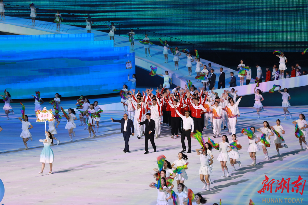(图为湖南方阵入场)本届学青会我省共派出三个代表团参加本届学青会,分别为参加校园组的湖南省代表团,参加公开组的长沙市代表团、岳阳市代表团。其中,湖南省代表团共有运动员448人参加田径、游泳、篮球、排球、足球、乒乓球、羽毛球、健美操(啦啦操)、武术、毽球10个项目的竞赛;长沙市代表团派出了近300名运动员,他们将参加本届学青会28个项目(公开组)的比赛;岳阳市代表团将派出43名运动员参加皮划艇(静水)、皮划艇(激流回旋)、举重、体操、跆拳道、摔跤、水球、射击等8个大项的比赛。