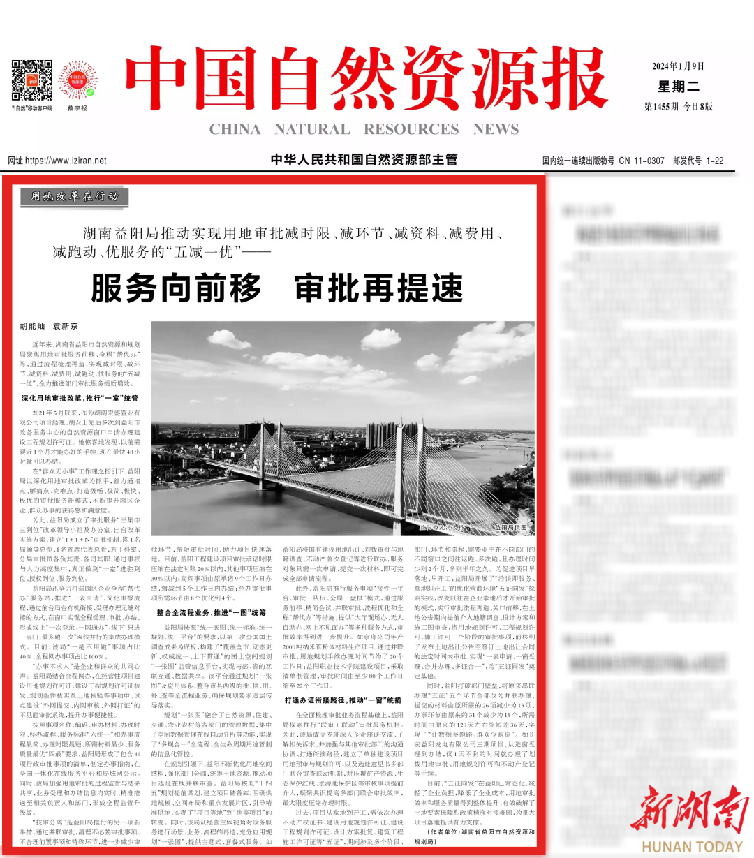 湖南日报·新湖南客户端1月10日讯(通讯员 胡能灿 袁新京)近年来,益阳市自然资源和规划局持续助力建设一流营商环境,聚焦用地审批服务前移、全程“帮代办”等,通过流程整理与再造,将事权与人力高度集中,以“严真细实快”的工作作风,实现用地审批“五减一优”,全力推进部门审批服务提质增效,有效破解了土地要素保障和政策精准对接难题,为重大项目落地提供有力支撑。1月9日,《中国自然资源报》重点推介了该局的经验做法。