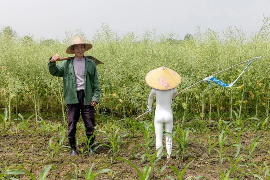 刘全书,他在镇上捡了一个衣店丢弃的假模特来当田里的守护神。