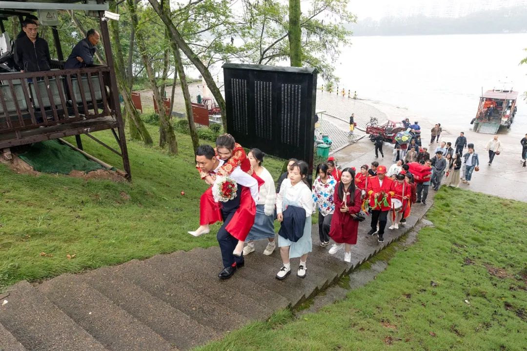 一对新婚夫妻。由于汽车不能过江,接亲的车队只能停在对岸。