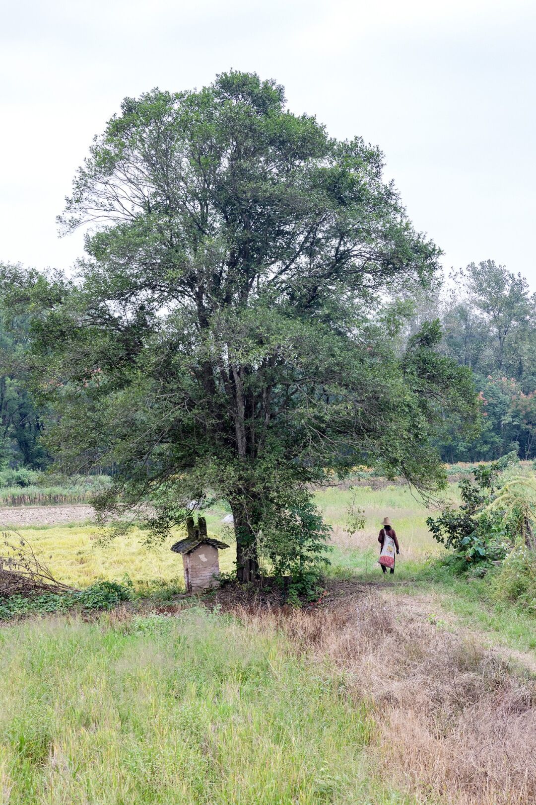 一位老人背着编织袋,穿过土地和树木,前往自家刚用机械收割的稻田里捡拾稻穗。