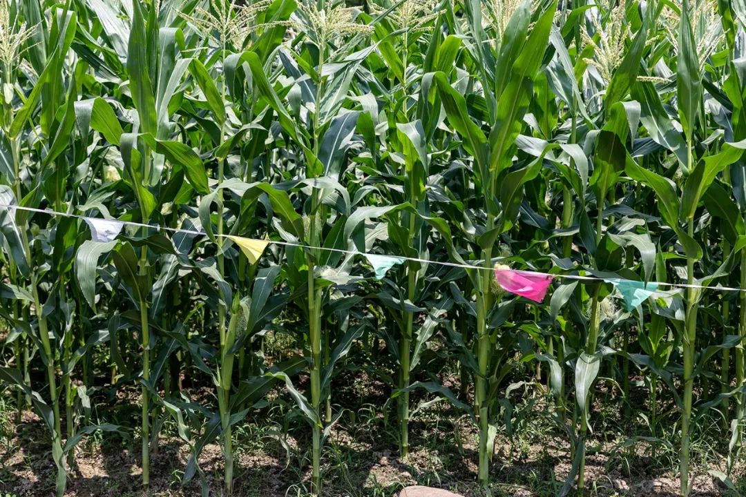 村民在玉米地边挂上彩旗,用于驱赶偷吃的鸟儿。