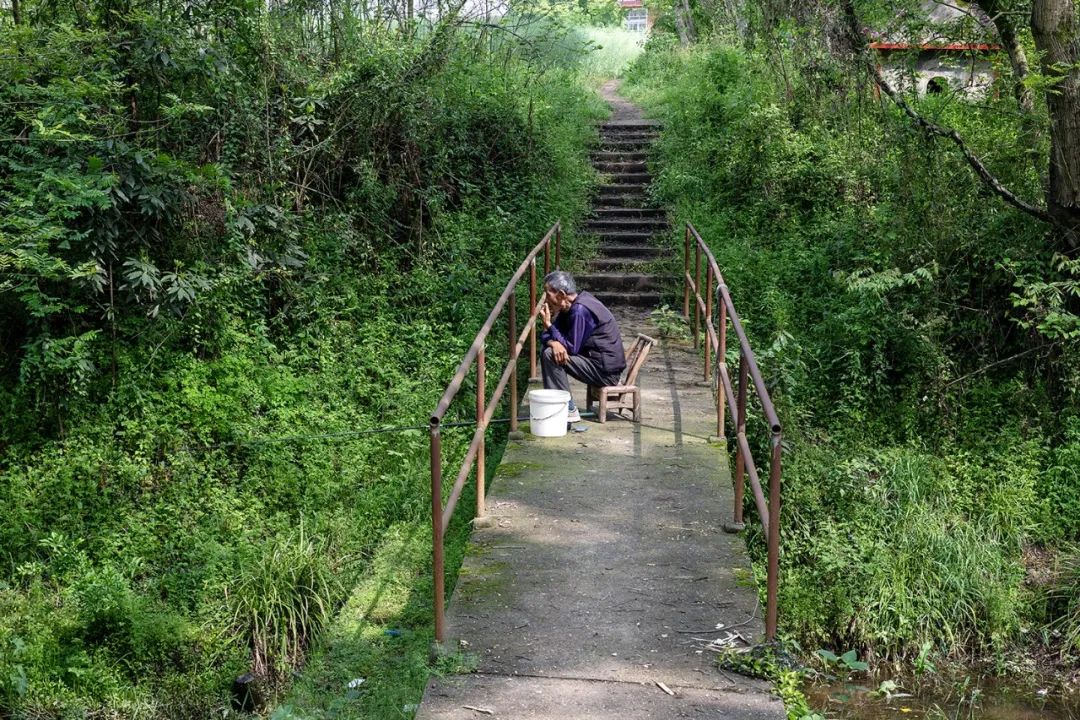 彭福林今年75岁,他正在自家门前的小港里钓鱼。