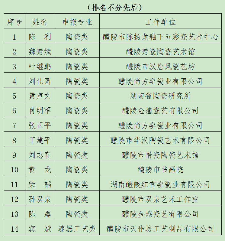 近日,从湖南省工艺美术协会传来喜讯,醴陵陈利、黄龙、宾斌等14人,荣获“湖南省工艺美术大师”称号。