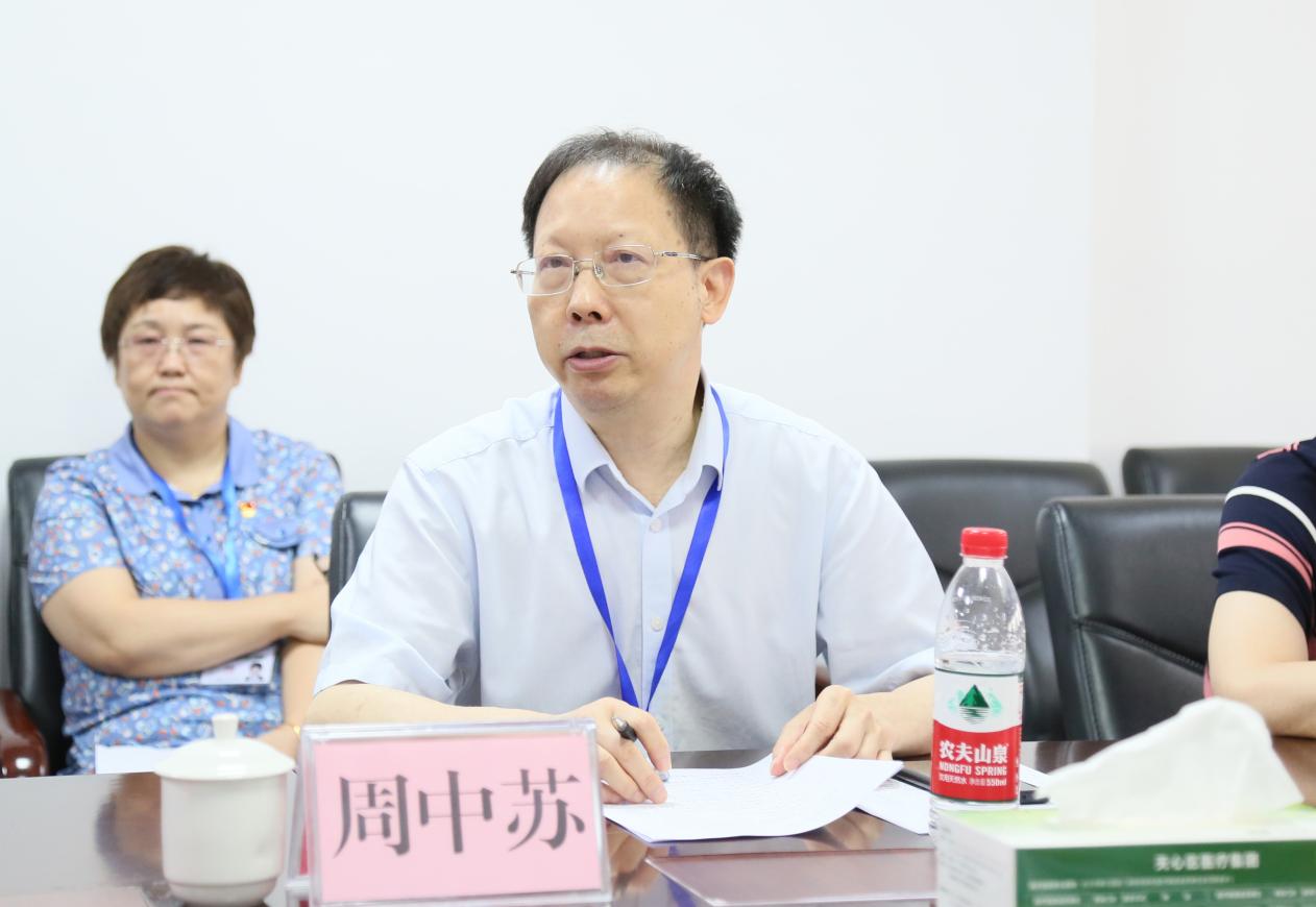 周中苏对省、市卫健委领导来院指导表示欢迎和感谢,他表示,医院党委大力支持天心区医疗集团建设工作,深入贯彻落实党的二十大关于促进优质医疗资源均衡布局精神,坚持党建引领,从人力、财力、物力等方面加大投入,全力推进紧密型城市医疗集团建设。