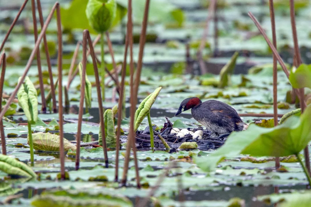 长沙市望城区高塘岭,小䴙䴘在孵蛋。